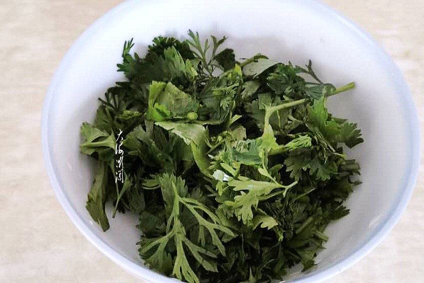 小香菜在淡盐水中浸泡10分钟,然后反复清洗干净,切段,香菜一定要放,特别调味,好吃。
