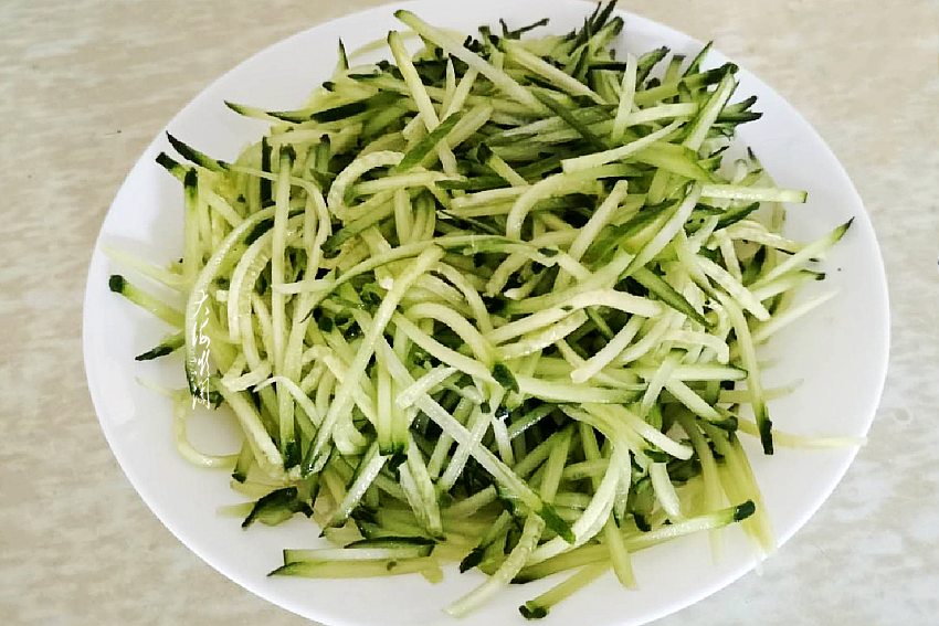 黄瓜在淡盐水中浸泡10分钟,然后反复清洗干净,切丝。也可以直接去皮洗净切丝,不过没有带皮颜色漂亮哈。