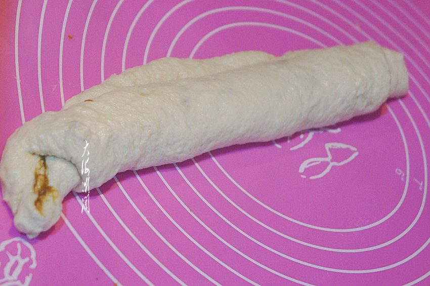 芝麻酱调成浆糊,面团发小后直接抹上,卷起来一烙火这烤箱一烤就完活了。