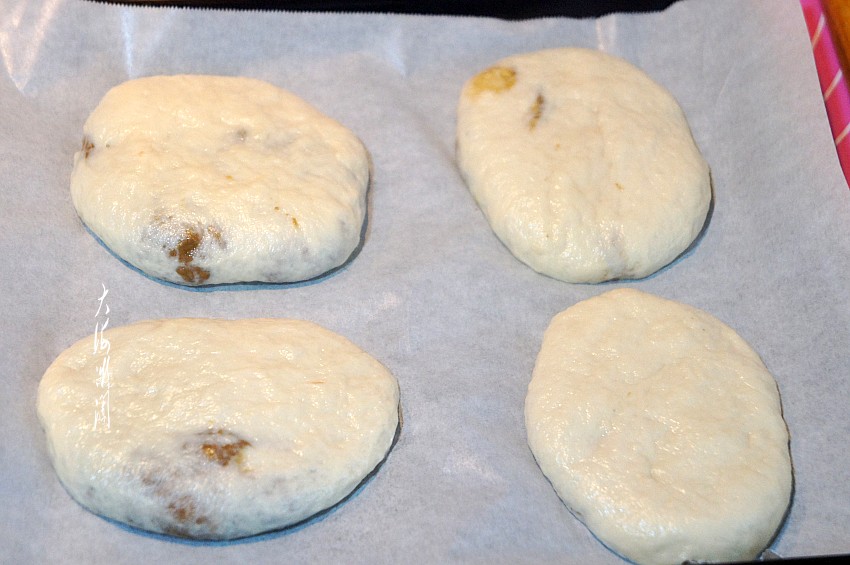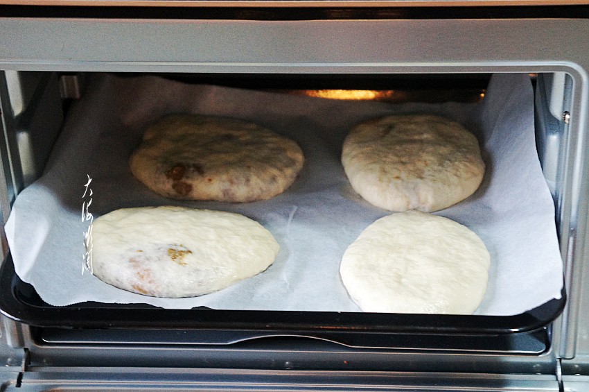 均匀分成4份,两头捏紧,压平,码入烤盘。可以用平底锅烙也可以直接用烤箱烤,烙饼更简单,我这个小饼快露出麻酱了,不适合烙改成烤了。还可以刷上油再蘸一层芝麻,这个就随自己喜欢的口味调整了。