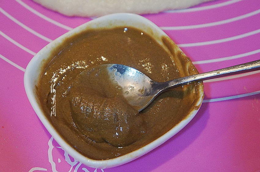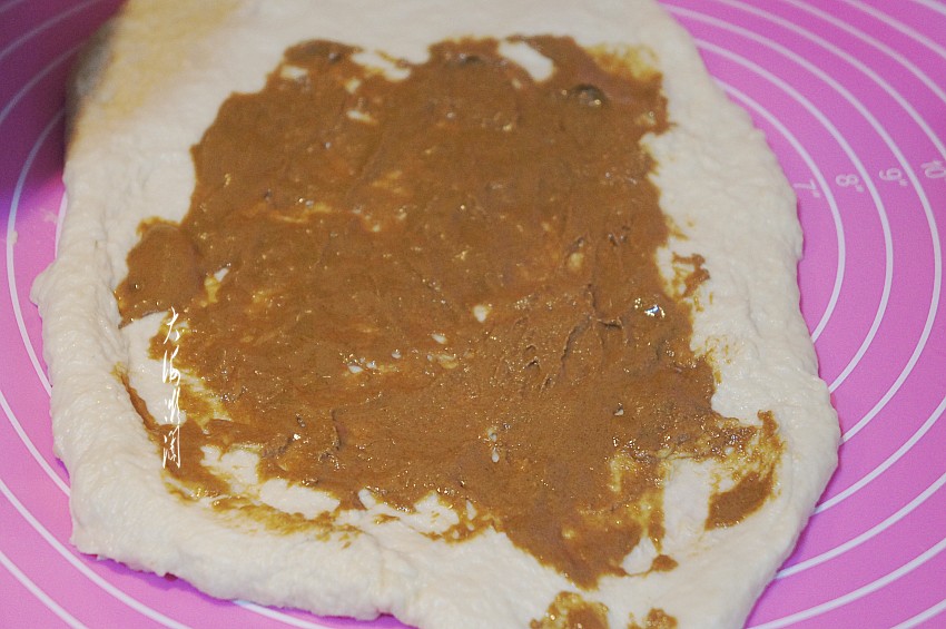 将面团擀成薄饼,均匀的涂抹上麻酱。