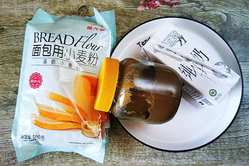 准备食材:面包粉加牛奶加芝麻酱。没有面包粉可换成普通面粉。