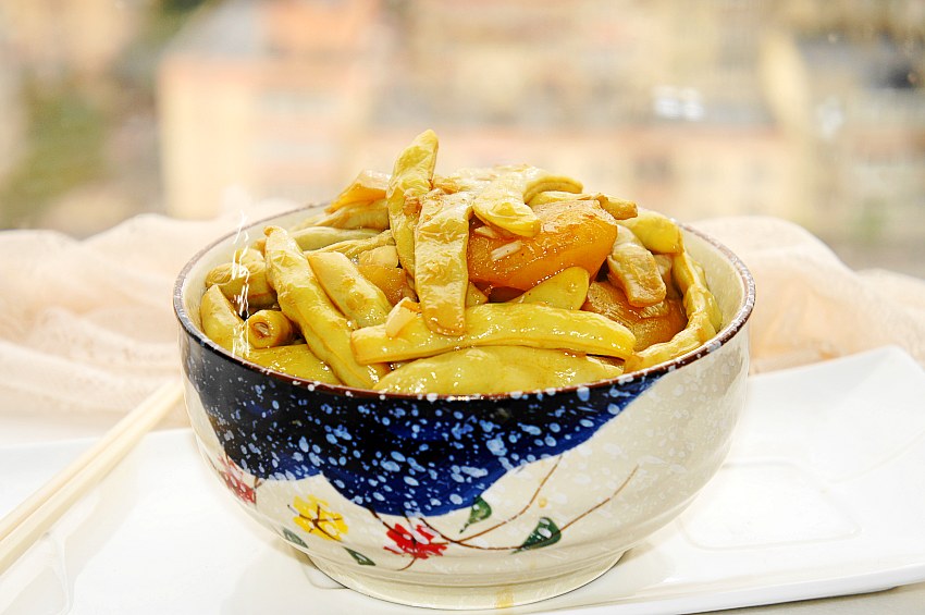 另起油锅,爆香五香粉和葱花,下入炒好的油豆角翻炒。油豆角富含膳食纤维、多种维生素和矿物质。有化湿补脾的作用,是合适每日都吃的蔬菜。
