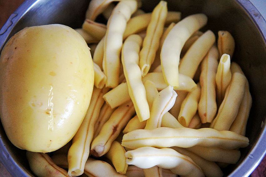 【炖豆角蒸玉米羹】所需食材:油豆角300g;土豆1个;嫩玉米2只;油适量;盐适量;五香粉适量;葱适量;蒜适量;生抽少许;胡椒粉适量。