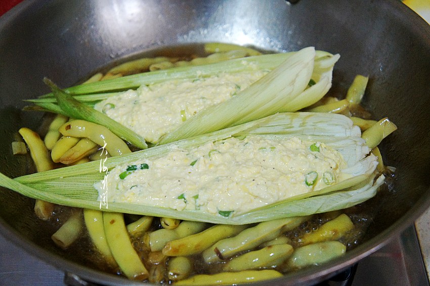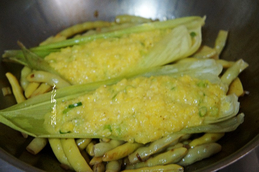 嫩玉米叶清洗干净,为防止滑漏,可放两层玉米叶,然后将调好的玉米糊放在玉米叶上,直接放到豆角的上边,大火烧开,中火炖熟。