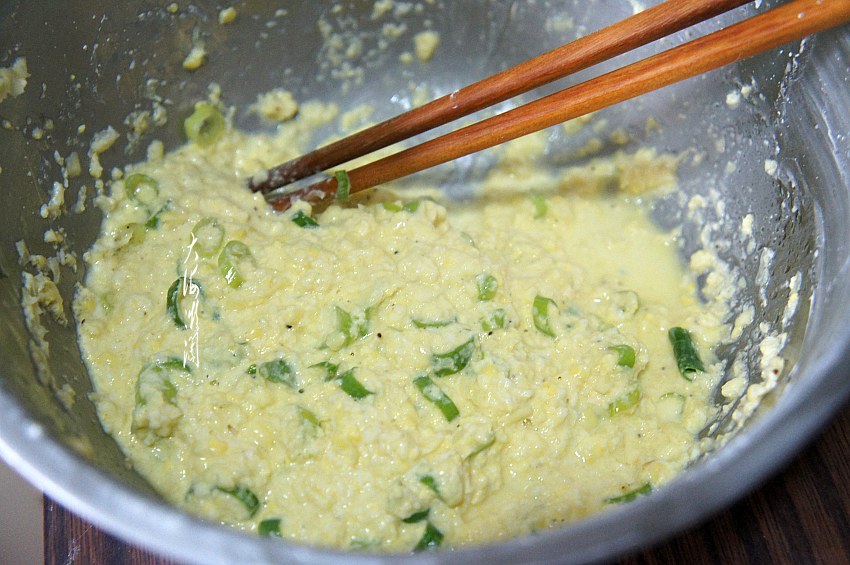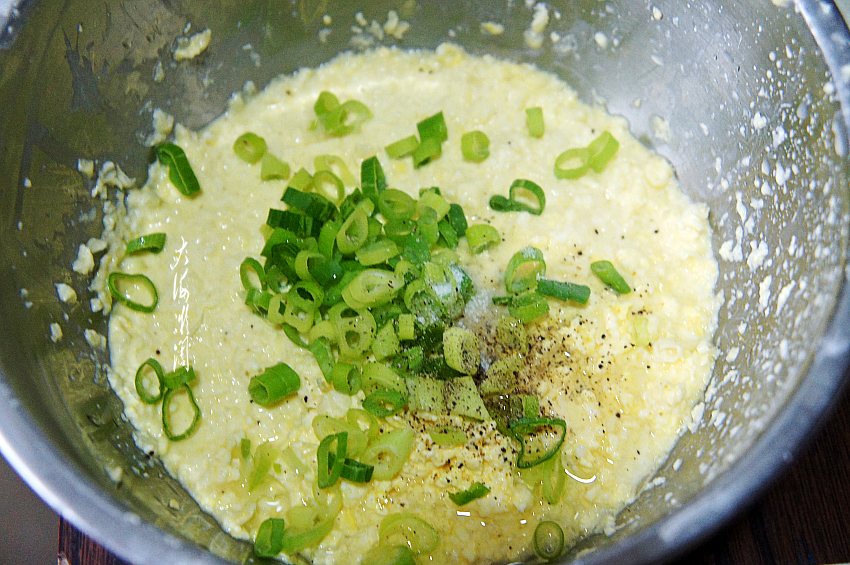 小葱去皮洗净切碎加入到玉米浆中,加入适量的盐、胡椒粉搅拌均匀调味。