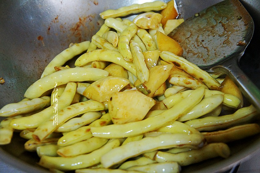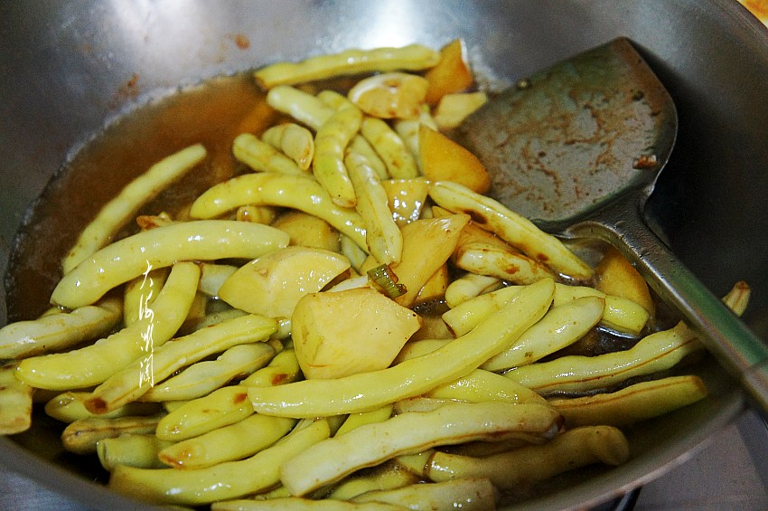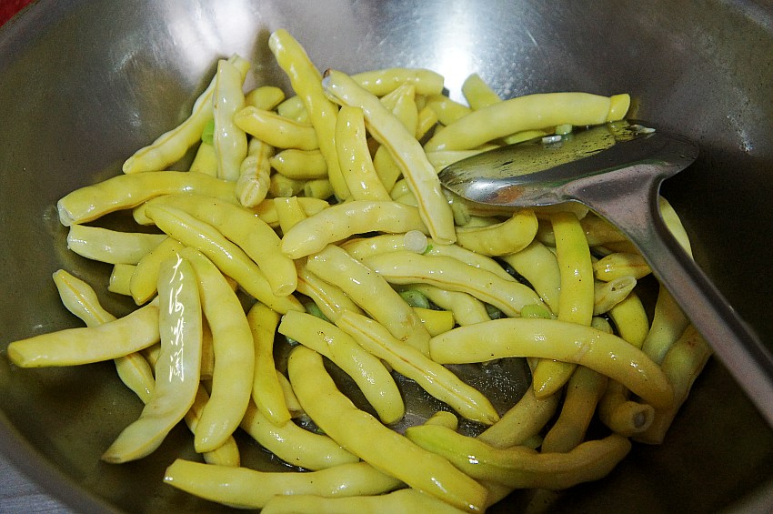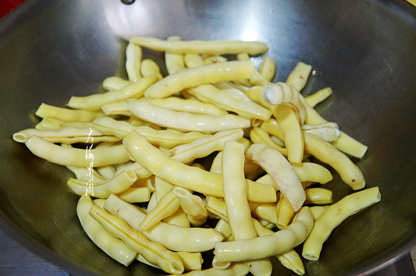 炒锅直接倒入洗干净的油豆角翻炒至没有水分,取出,刷洗一下炒锅。这样炒的豆角口感好,特别好吃。