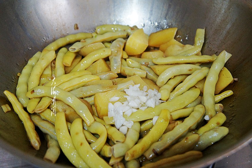 豆角中再加点盐、大蒜碎调味,夏天多吃点大蒜既提味又保健,大蒜是天然的消炎药,常食有利于健康。