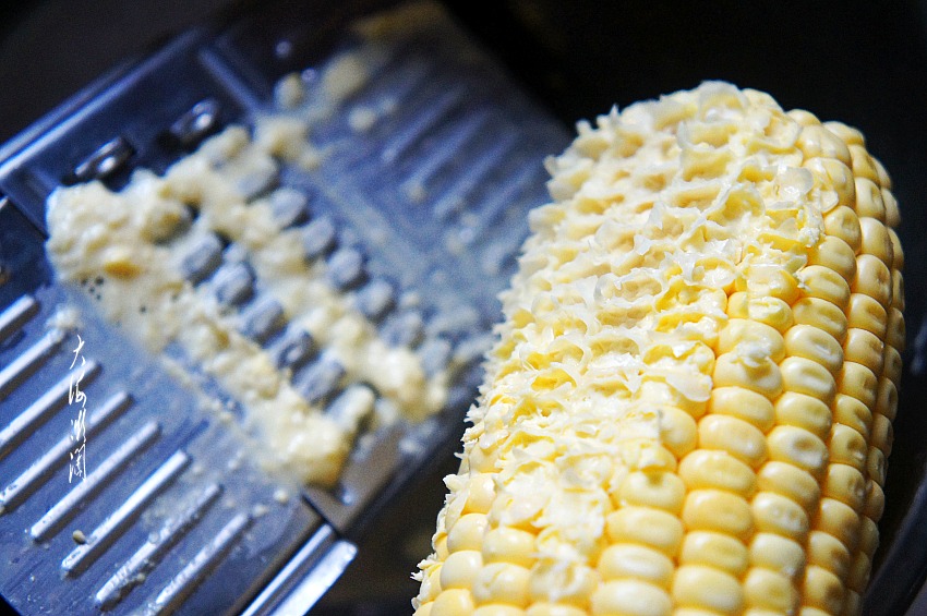 嫩玉米洗净,这样用擦板擦成玉米浆,注意,买玉米一定要选择嫩玉米,老了浆少,不够粘糯。