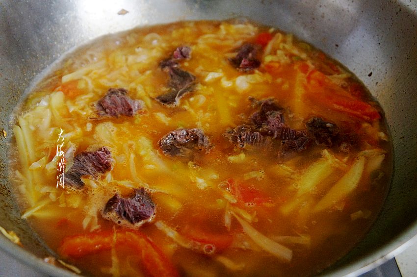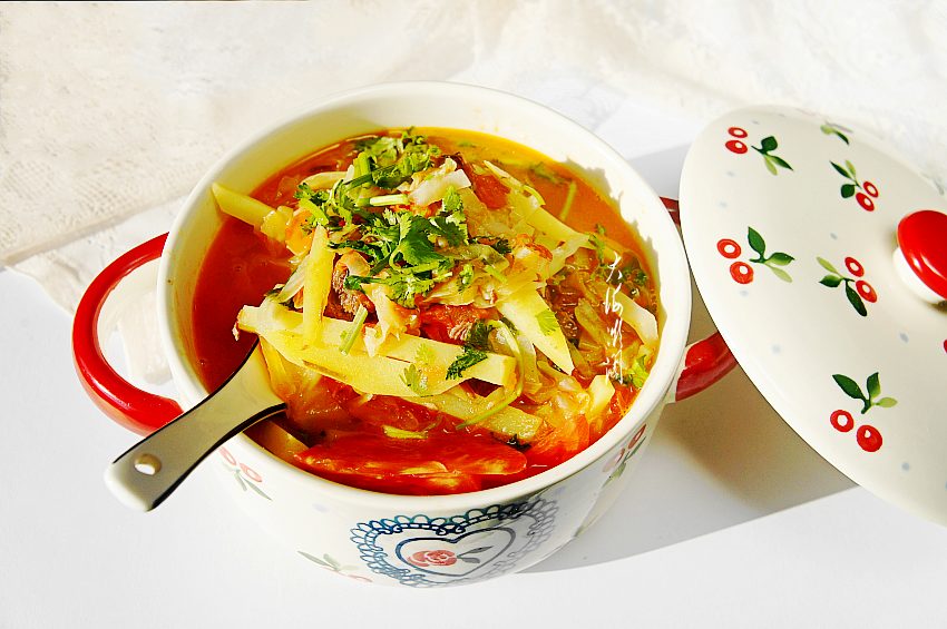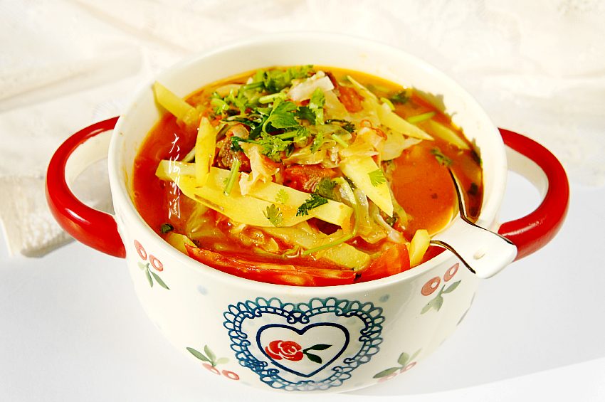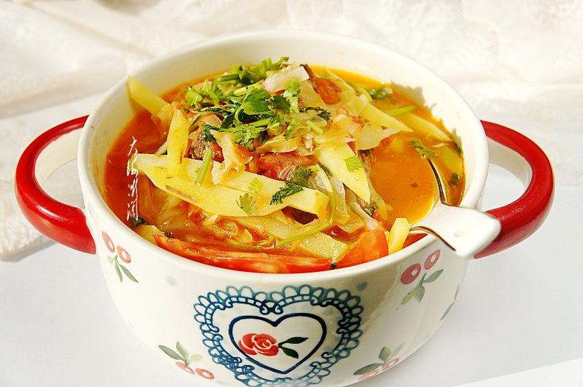 这汤别看是食材的简单搭配,营养超级丰富,含有丰富的蛋白质、番茄红素、维生素、等,口感是酸中带甜、甜中飘香。其中享有“肉中骄子”之美称的牛肉低脂肪,含有丰富的铁和蛋白质,长身体的孩子能补充血细胞所需要的营养,越喝越聪明。土豆以其营养丰富和养分平衡,被欧美国家当作“减肥食品”或健康食品。而土豆还是一种含钾量特别高的食材,常吃可以放松肌肉和神经,能够帮助睡眠和运动后放松。西红柿富含番茄红素,它是一种抗氧化剂,具有防晒伤、抗衰老的作用。卷心菜含有不可溶性的膳食纤维,可以促进胃肠道蠕动,加快食物通过胃肠道,减少脂肪吸收,促进排泄。由此可见,这道菜的确营养丰富,不但补充营养补充能量,还能减肥瘦身,美白肌肤。