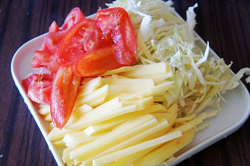 卷心菜切丝,土豆切条,西红柿可以开水烫一下去皮,一个切块。
