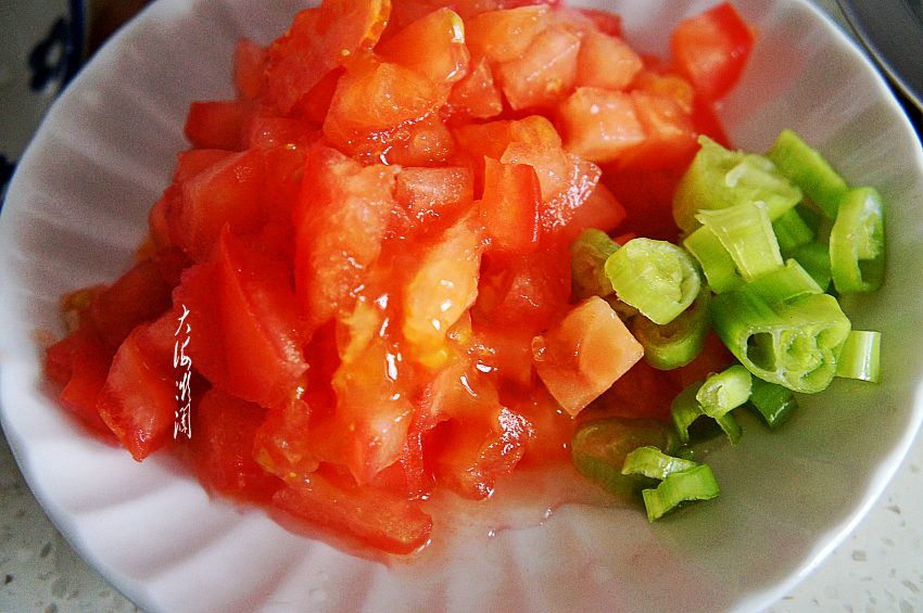 另一个切丁,便于炒制成番茄汁,比加番茄酱更有营养,而且颜色和味道都很浓郁。小葱去皮洗净切碎。