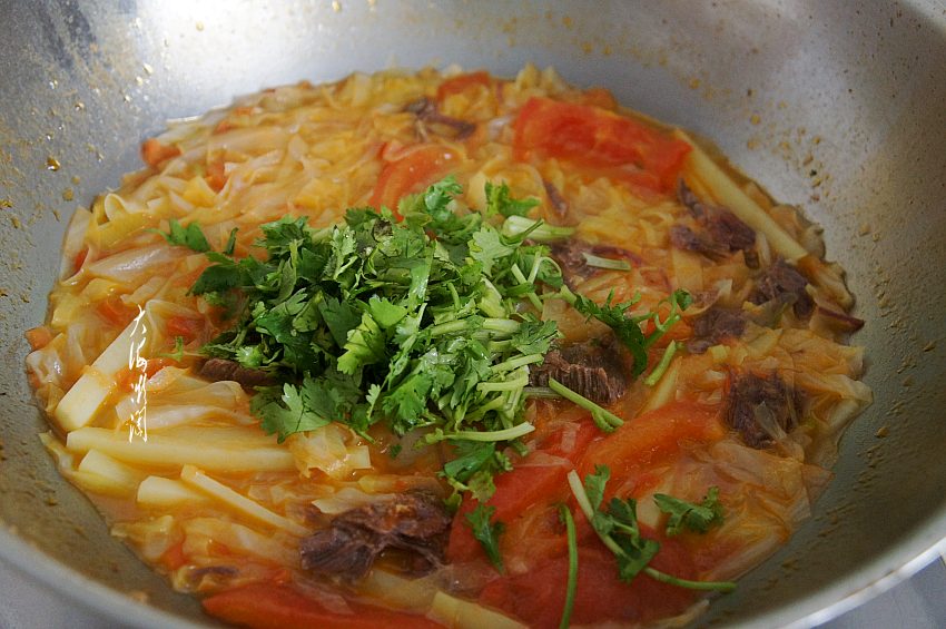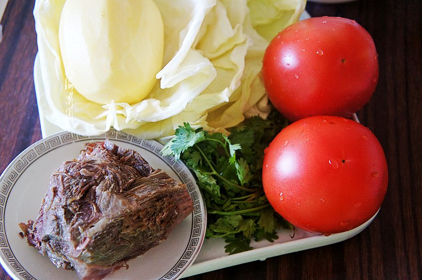 准备食材:牛肉是之前做好的酱牛肉,很软烂。卷心菜、西红柿、香菜在淡盐水中浸泡10分钟,然后洗净,土豆去皮洗净。