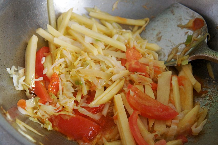 加入准备好的卷心菜丝、土豆条和西红柿翻炒,炒至卷心菜变色。