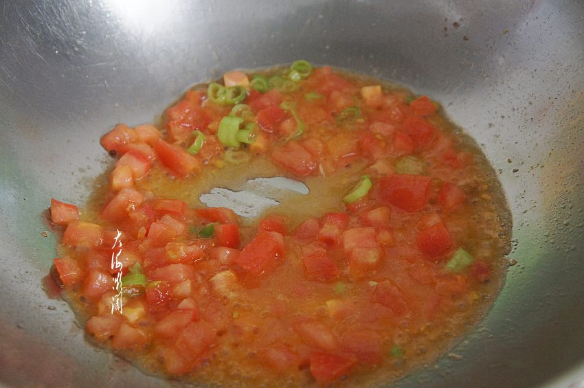 炒锅加入适量的油,爆香葱花,下入西红柿丁翻炒,炒出浓郁的番茄汁。