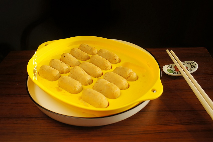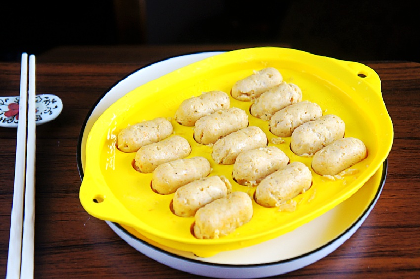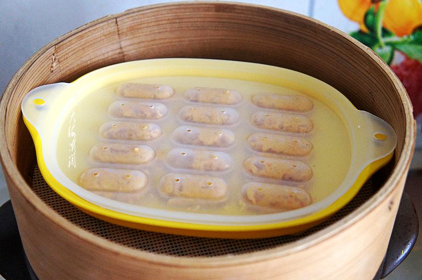 时间到,关火,取出模具,稍凉后脱模,很好脱模的。蒸好的鸡肉肠可以直接吃,也可以煎或者烤着吃,小朋友特喜欢烤肠。