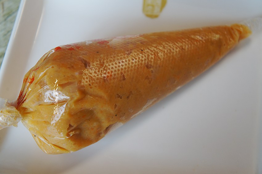 将打好的肉泥装入裱花袋,没有裱花袋可用保鲜袋代替,剪一个小口。
