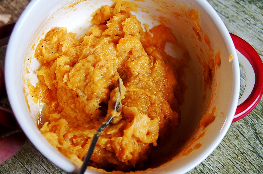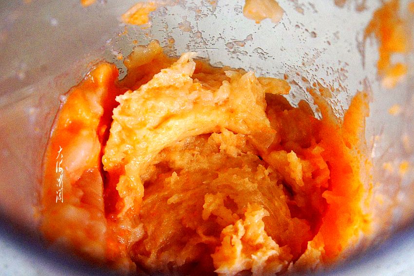将胡萝卜、土豆泥先放入料理机打碎,再加入鸡肉丁,打成肉泥。