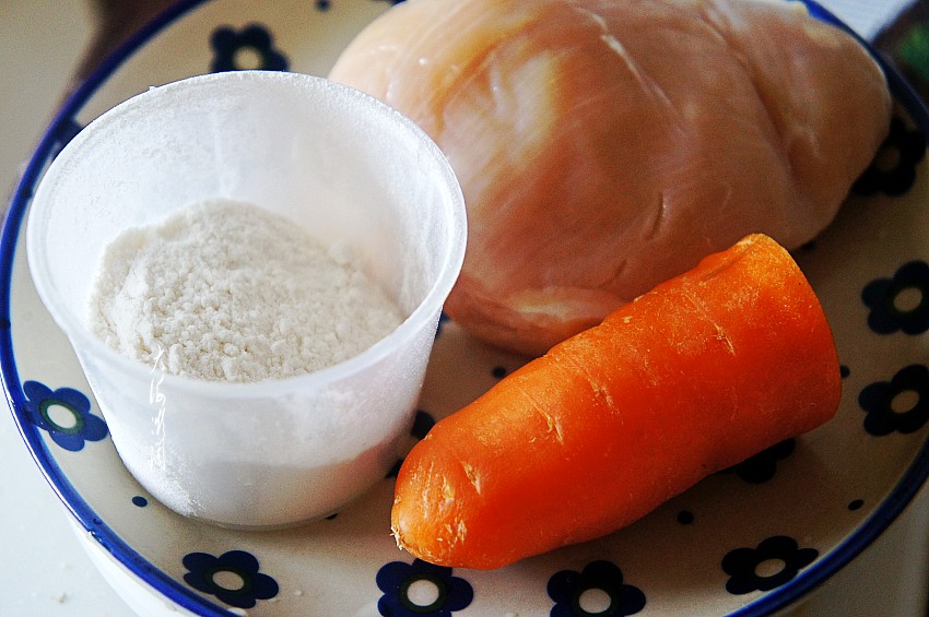 准备食材:胡萝卜去皮洗净;鸡胸肉洗净,剔出粘膜。
