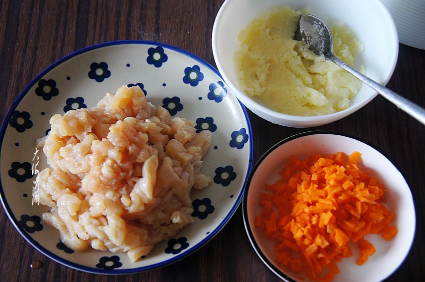 土豆去皮洗净,上屉蒸熟,压成土豆泥。鸡胸肉切小丁,胡萝卜去皮洗净切碎。