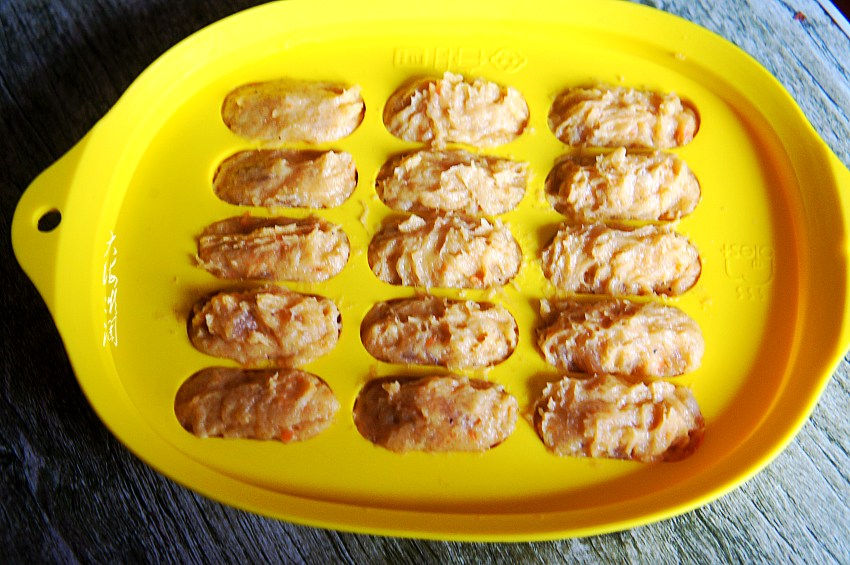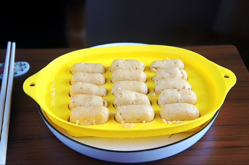 将鸡肉泥挤入模具中,没有模具可以准备一张锡纸,抹上一层食用油,把肉泥挤在锡纸上卷起来也不错。