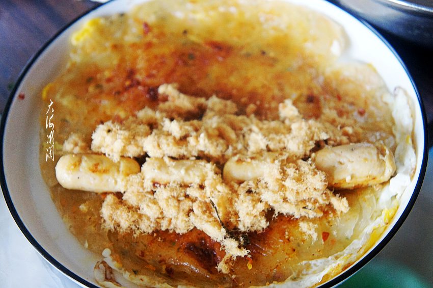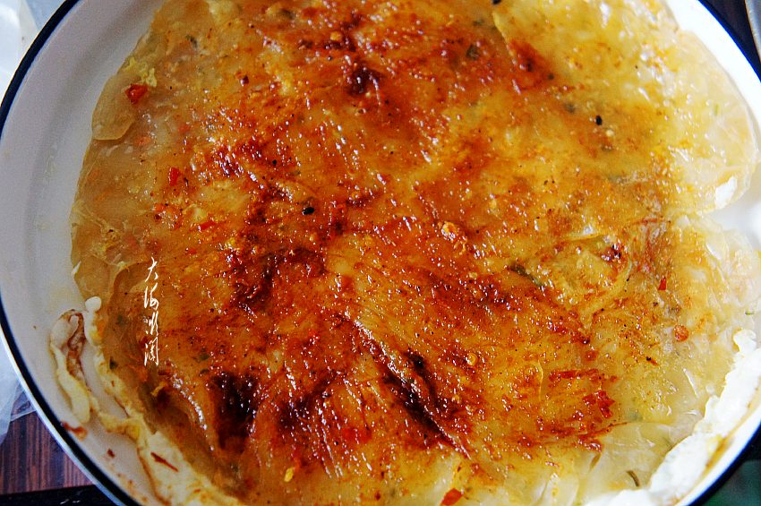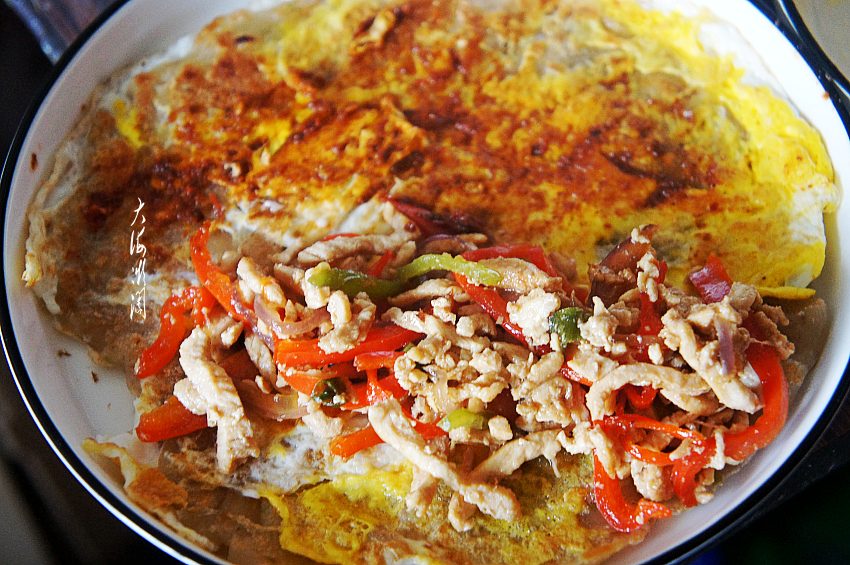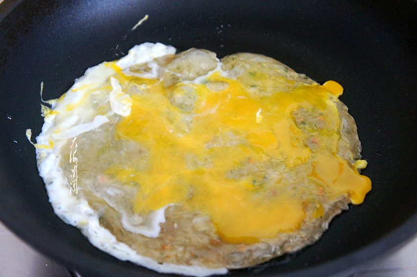 翻面,打入一个鸡蛋,用木铲将其摊平,然后再翻面煎熟。