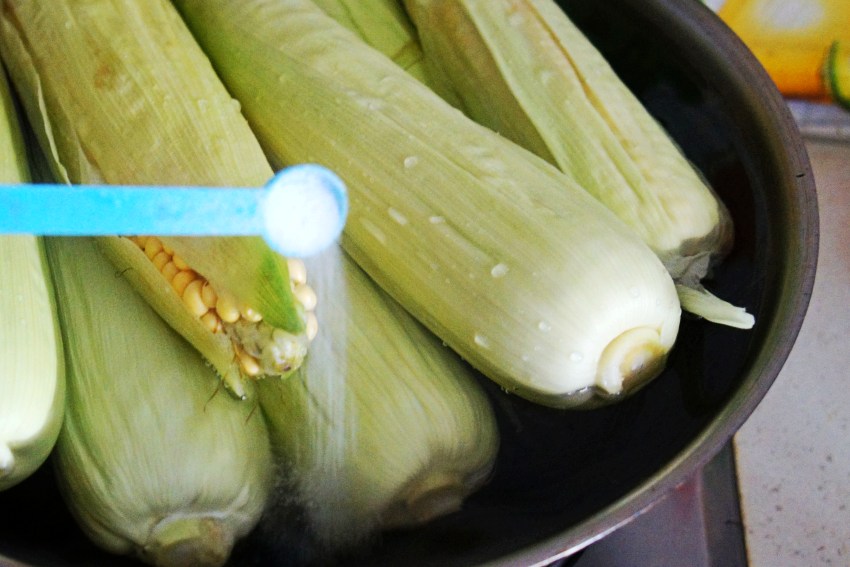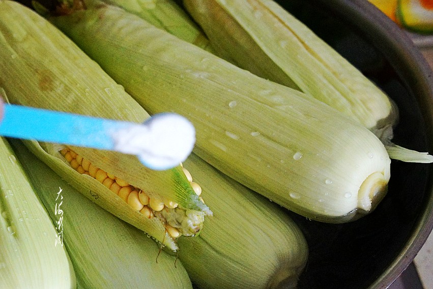 再加2平勺小苏打,大约3~4g,加小苏打的目的是促进玉米快速煮熟,还能增香,就像我们煮大碴子粥一样,加点小苏打还能促进营养成分的吸收。但是如果是很鲜嫩的玉米我还是不建议加盐加小苏打,首先说原汁原味的嫩玉米最鲜美最好吃,其次是加了盐和小苏打后也损失了煮玉米的汤汁,汤汁更具营养成分,而且甜甜的也特别好喝。加了盐和小苏打后,这甜甜的汤汁就不能喝了。