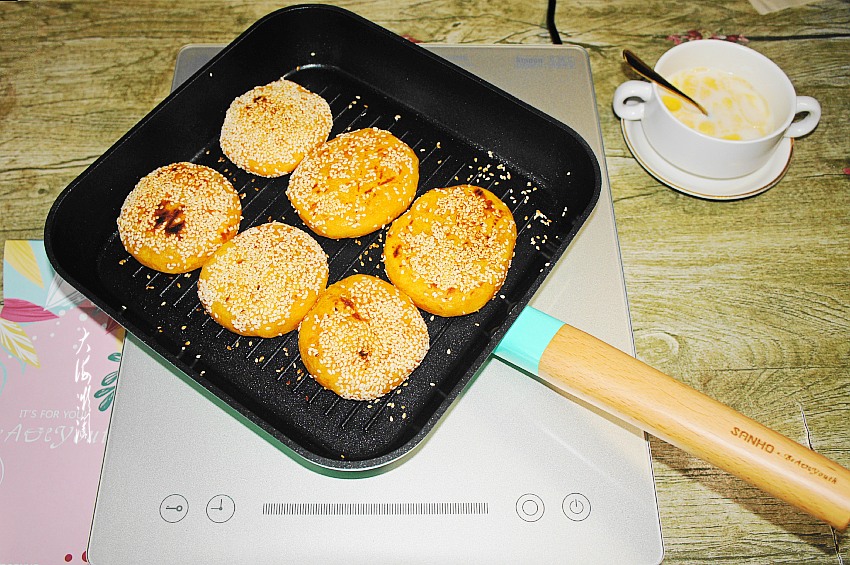 全部包好的红薯饼码入不粘煎锅,置电磁炉上中火煎。刚刚入手一款三禾煎烤锅,大气,颜值高,这锅不只能用来煎烤,用来煮面煲汤也是不错的选择。重要的是抗菌不粘锅,有油没油都能煎,无油烟,复合锅底,不挑炉灶,电磁炉煤、气灶都能用,而且受热均匀,加热也快,非常实用。今天是第一次使用,一点油烟也没有,非常喜欢。