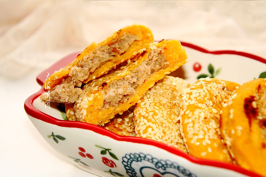 【红薯豆沙馅饼】所需食材:蜜薯1个;面粉100g;豆沙馅适量;白芝麻适量;小苏打1g;油少许。