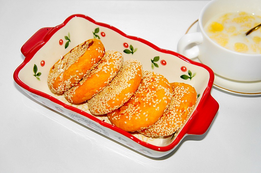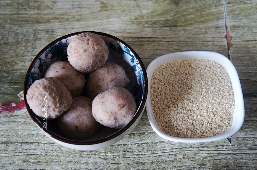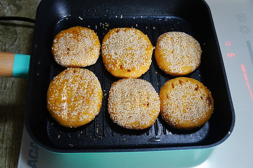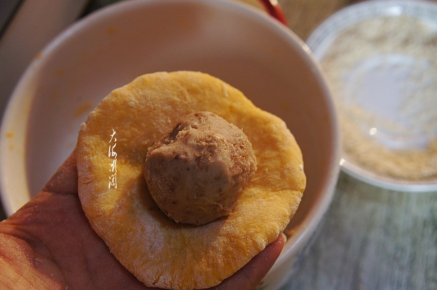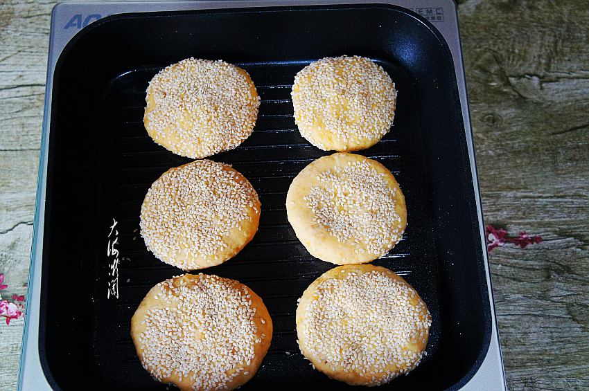 这个面团都不需要使用面板操作,很简单,从面团上揪一块面,用手压扁,加入一个豆馅,团成球状再压成饼,然后两面粘上白芝麻就OK了。