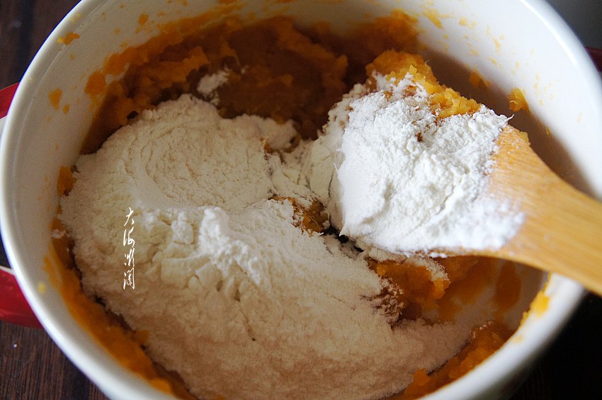 加入适量的面粉,面粉用量根据红薯泥的干稀程度不同而变化,能和成面团就好,加入适量的小苏打,这是关键的一步,烙出的红薯饼更松软,100g面粉,加1g小苏打就好,不加一滴水揉成面团。