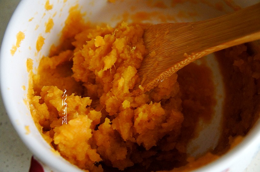 蒸熟的蜜薯稍凉去皮,趁热用勺子把去皮的蜜薯块压成薯泥,喜欢更甜一些可以加点白糖,不加白糖也很甜。
