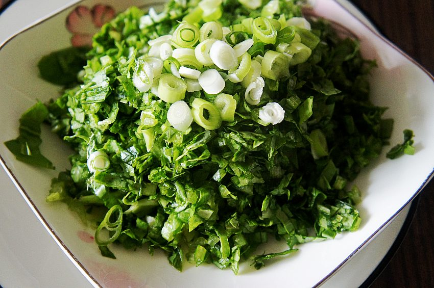 油麦菜切碎,小葱去皮洗净,切碎。出锅加点葱花很提味,如果不喜欢葱的味道,可以不加。