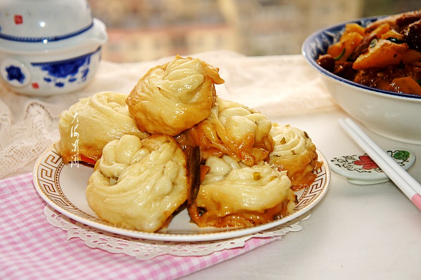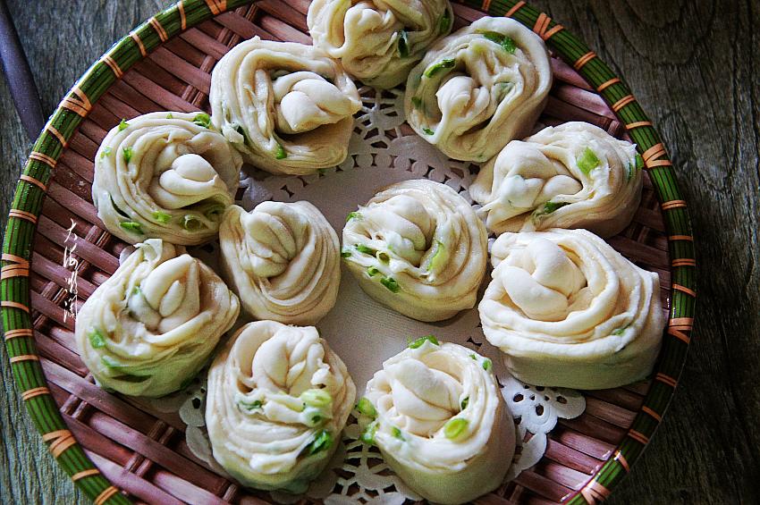 之前准备好的生花卷直接放在上边。喜欢吃粗粮的再贴上一圈大饼子,东北话,贼好吃。