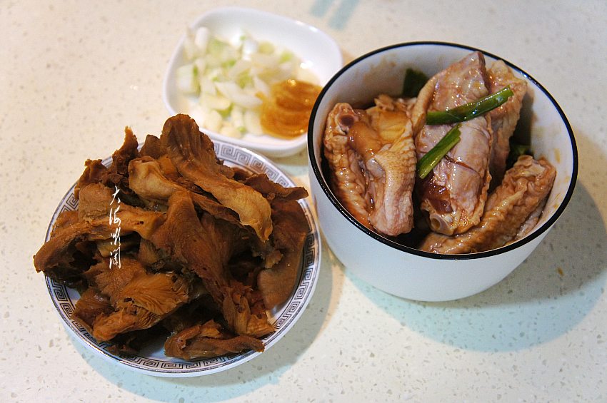 鸡翅中洗净,里外斜切几刀,便于入味。将翅中放入容器中,加入葱、姜、蒜、照烧鸡汁腌制一下,我是早上腌制中午做的,非常入味。元蘑一把,冷水浸泡1小时左右,然后去掉杂质,清洗干净,攥掉水分,没有元蘑换成香菇,不过干元蘑味道特好,比肉都香。葱姜蒜洗净切碎。
