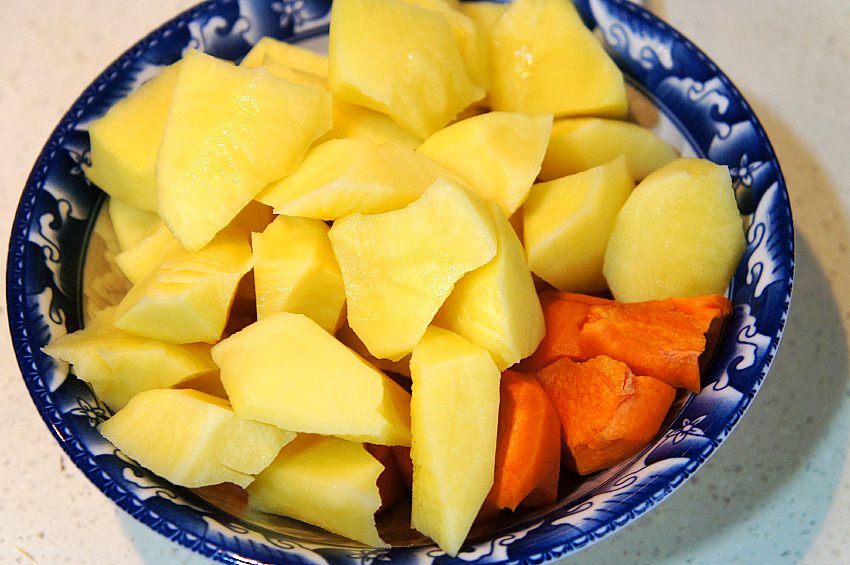 土豆、胡萝卜去皮,洗净,切滚刀块,这样切口感好。