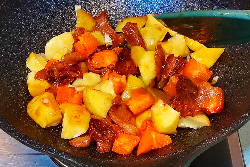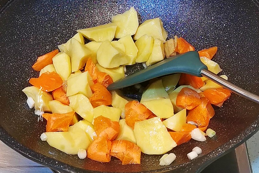 炒锅加入适量的油,爆香葱姜蒜,下入土豆胡萝卜翻炒。