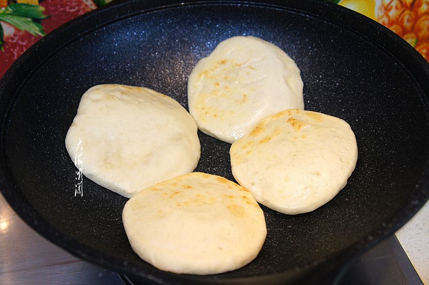 翻面再次盖上锅盖焖1分钟,大约4分钟左右就可以烙好了。