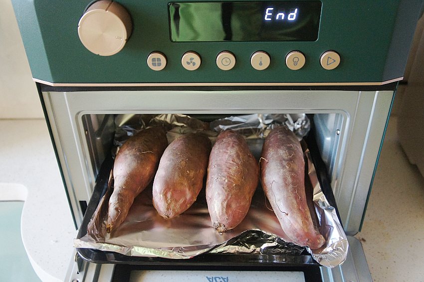 我用的是空气炸烤箱,将蜜薯放入炸烤箱中,关闭烤箱门,选择空气炸功能,190度炸25分钟,根据蜜薯的个头大小不同,炸烤的时间也不同,初次定20分钟,然后看看没烤透再补几分钟。