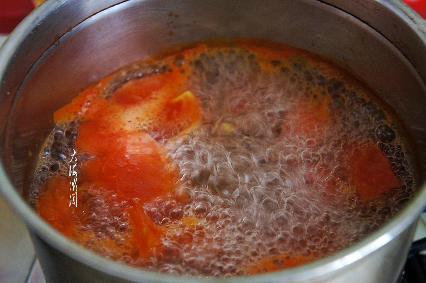 汤锅加入适量的水,下入西红柿块大火煮开,中火煮2~3分钟。