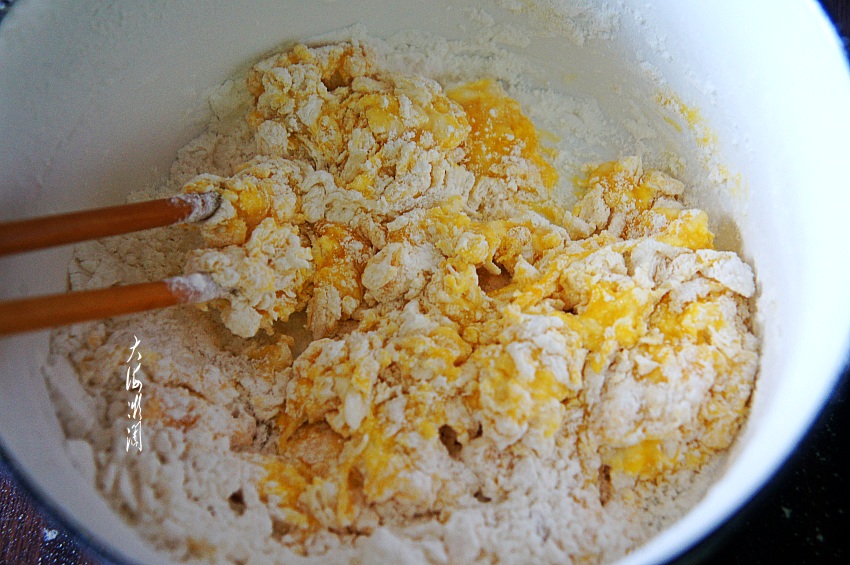 鸡蛋打散,加入面粉,搅拌均匀。这是2人份的量,如果人多,可是适量增加鸡蛋和面粉的用量。