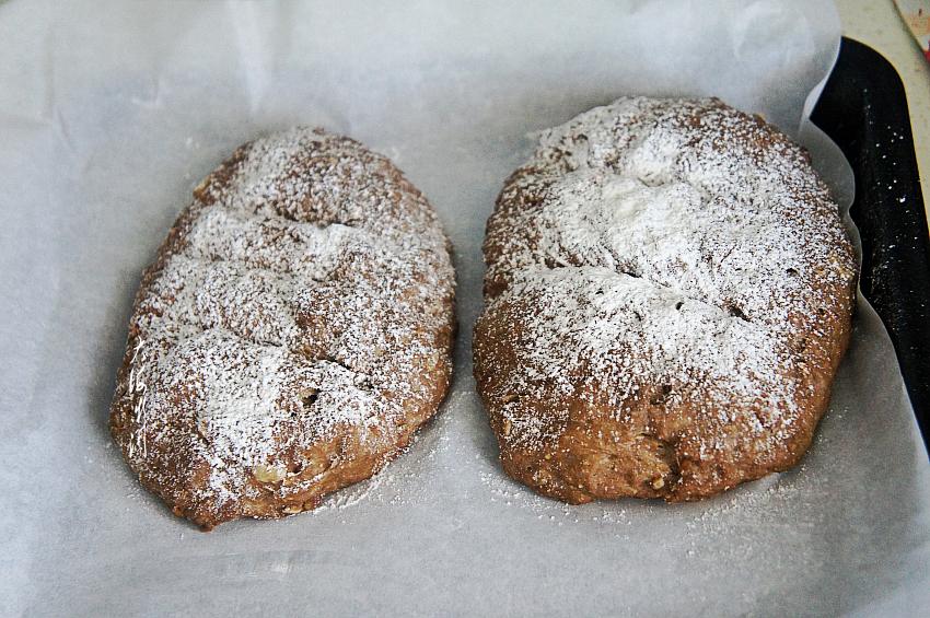 时间到,二次发酵完成后取出烤盘,烤箱先200度预热5分钟,预热期间将发酵好的黑麦面包用锋利的刀片割出自己想要的花纹,表面筛层面粉装饰一下。