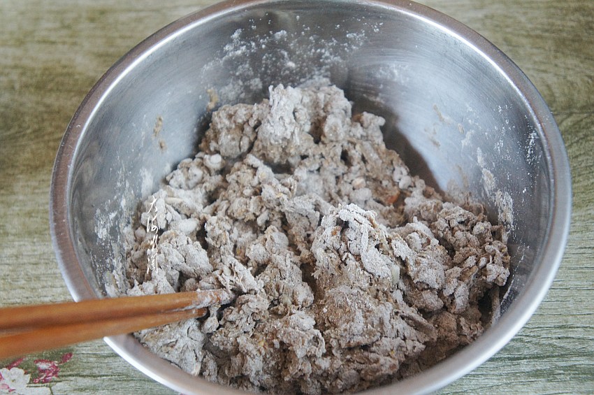在面包粉中慢慢地加入155克的纯净水,用筷子把面粉和水搅拌成没有干粉的状态,静置一会。