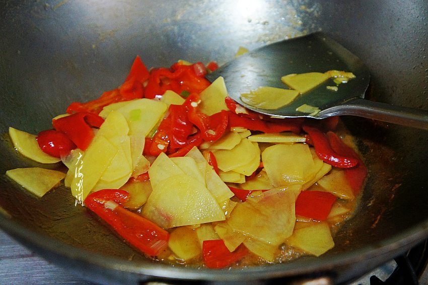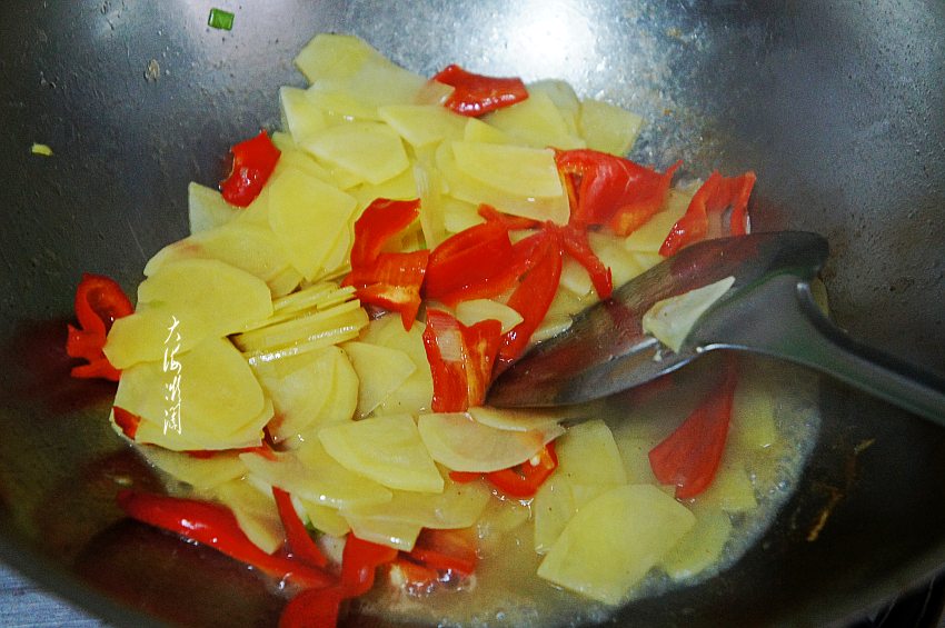 要想尖椒土豆片好吃,关键的最后一步来了,土豆片和青椒炒至大约七成熟时,加入少许浸泡土豆片的水,让土豆片和青椒熟透,略有芡汁的作用。