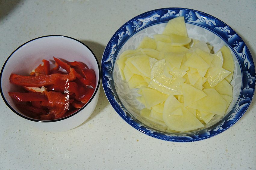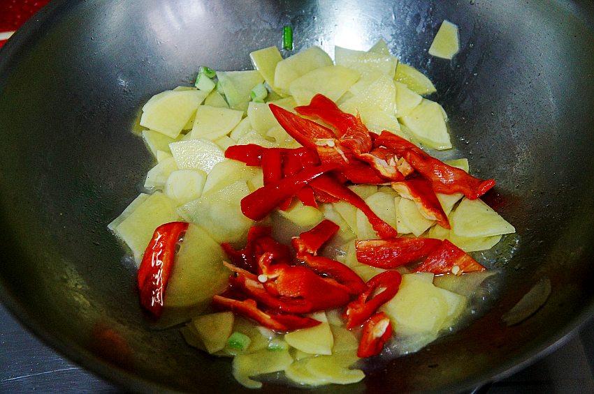 辣椒洗净切块,今天选用红色的尖椒,炒后颜色更漂亮,浸泡好的土豆片捞出备用。
