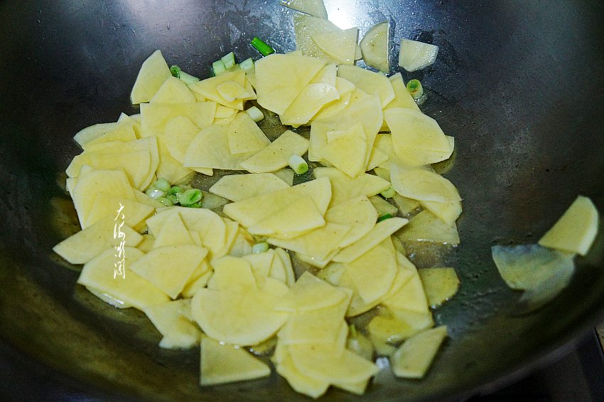 炒锅加入适量的油,爆香五香粉和葱碎蒜片,加入控净水分的土豆片翻炒。