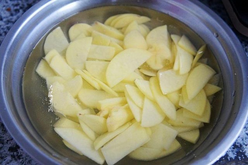 1、要想青椒炒土豆片好吃第一步是关键,切好的土豆片要入冷水浸泡10分钟以上,泡出淀粉,很关键的一步,否则一炒就黏糊糊的,再炒就碎了。