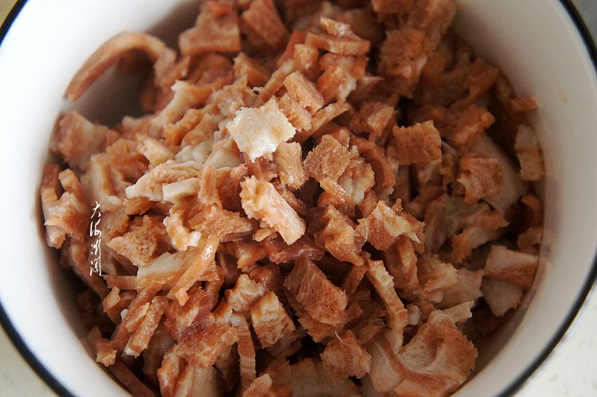 解冻后的培根肉切成肉丁,不用腌制了,本身就是腌制好的肉。