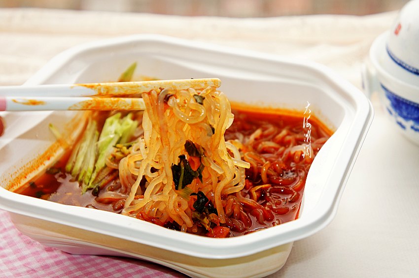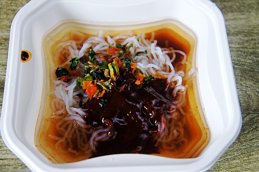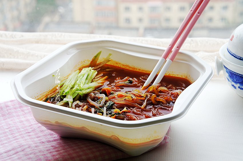 打开粉包,倒掉魔芋粉包中水分,方便的话可以过水冲一下(可省略哈),加入其他几个料包中的食材,再提醒一次,不能吃辣的同学酱包要少加哈,不然你指定吃不下。加入一杯开水冲泡,三秒就可以开吃了。也可以加入凉水,时间没区别,一样三秒钟就开餐。