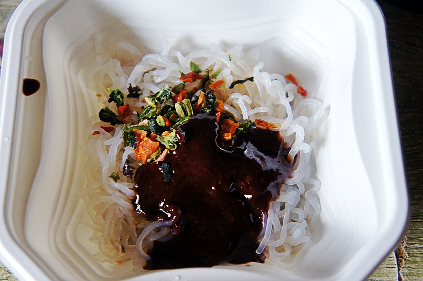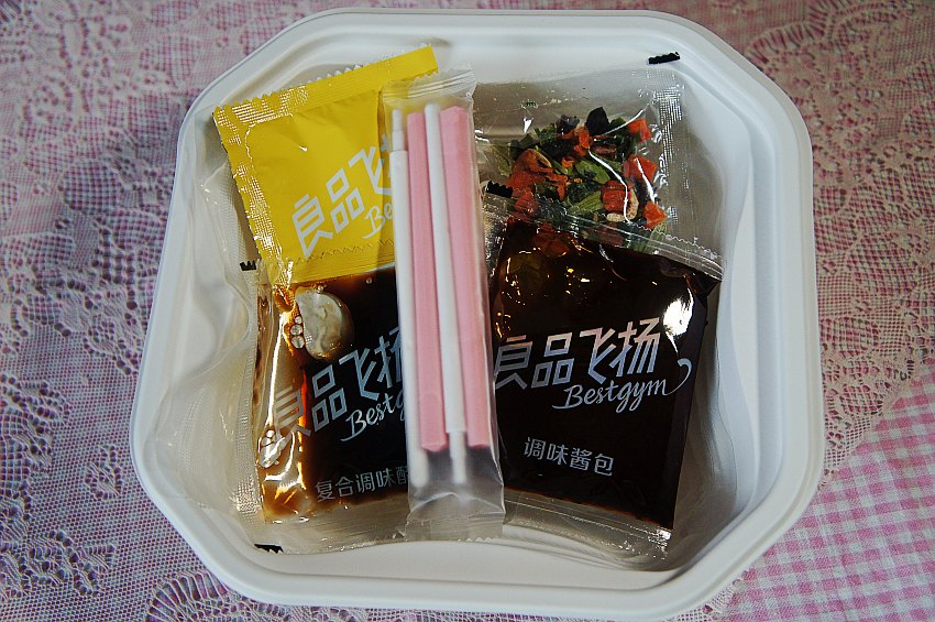 取出包装看看,有这么多食材,包括一个魔芋粉丝包,一个酱包,一个菜包,一个醋包,还有一个粉包,料足啊,比吃方便面可简单多啦,无油炸更健康。